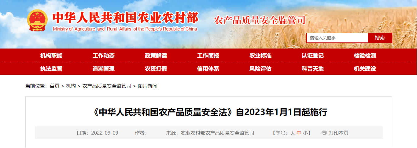 2022年9月2日,全國(guó)人大常委會(huì)第三十六次會(huì)議通過(guò)了修訂后的《農(nóng)產(chǎn)品質(zhì)量安全法》,自2023年1月1日起施行。新版《農(nóng)產(chǎn)品質(zhì)量安全法》將進(jìn)一步加強(qiáng)從農(nóng)田到餐桌的全過(guò)程監(jiān)管。為全面體現(xiàn)“四個(gè)最嚴(yán)”的要求,新修訂的農(nóng)產(chǎn)品質(zhì)量安全法,在關(guān)于農(nóng)產(chǎn)品質(zhì)量安全的定義中增加生產(chǎn)經(jīng)營(yíng)的農(nóng)產(chǎn)品達(dá)到農(nóng)產(chǎn)品質(zhì)量安全標(biāo)準(zhǔn)的內(nèi)容;在國(guó)家建立健全農(nóng)產(chǎn)品質(zhì)量安全標(biāo)準(zhǔn)體系的基礎(chǔ)上,明確要求“確保嚴(yán)格實(shí)施”;在農(nóng)產(chǎn)品質(zhì)量安全標(biāo)準(zhǔn)中增加“儲(chǔ)存、運(yùn)輸”農(nóng)產(chǎn)品過(guò)程中的質(zhì)量安全管理要求。