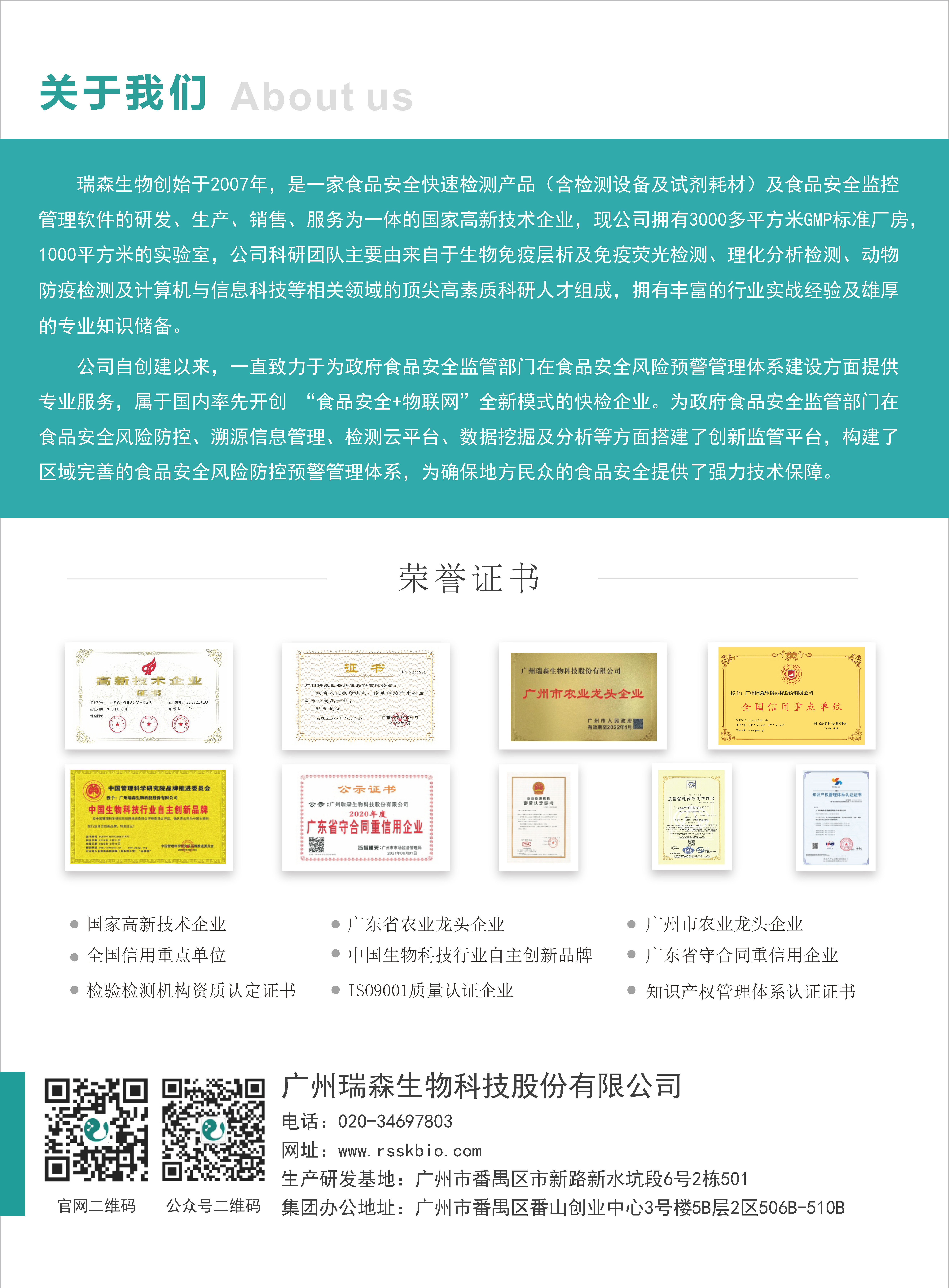 瑞森生物作為廣東省重點(diǎn)農(nóng)業(yè)龍頭企業(yè),一直致力于食品安全檢測(cè)行業(yè),至今已深耕十六年之久。公司在食品安全檢測(cè)領(lǐng)域發(fā)揮了技術(shù)優(yōu)勢(shì),憑借精湛的技術(shù)為客戶提供優(yōu)質(zhì)、穩(wěn)定、可靠的產(chǎn)品,為國(guó)人食品安全保駕護(hù)航,也為推動(dòng)食品檢測(cè)行業(yè)高質(zhì)量發(fā)展貢獻(xiàn)了企業(yè)力量。公司屬國(guó)家高新技術(shù)企業(yè),廣東省重點(diǎn)農(nóng)業(yè)龍頭企業(yè),廣州市農(nóng)業(yè)龍頭企業(yè),全國(guó)重點(diǎn)信用單位,廣東省守合同重信用企業(yè),中國(guó)生物科技行業(yè)自主創(chuàng)新品牌企業(yè),目前擁有國(guó)家專利29項(xiàng),國(guó)家軟件著作權(quán)18項(xiàng),高新技術(shù)產(chǎn)品15項(xiàng),技術(shù)項(xiàng)目研發(fā)5項(xiàng)。公司現(xiàn)擁有快速檢測(cè)試劑和設(shè)備上百種,核心產(chǎn)品通過農(nóng)業(yè)農(nóng)村部驗(yàn)證,可為監(jiān)管部門、農(nóng)牧企業(yè)、經(jīng)銷商提供專業(yè)、全面的檢測(cè)產(chǎn)品和服務(wù)。