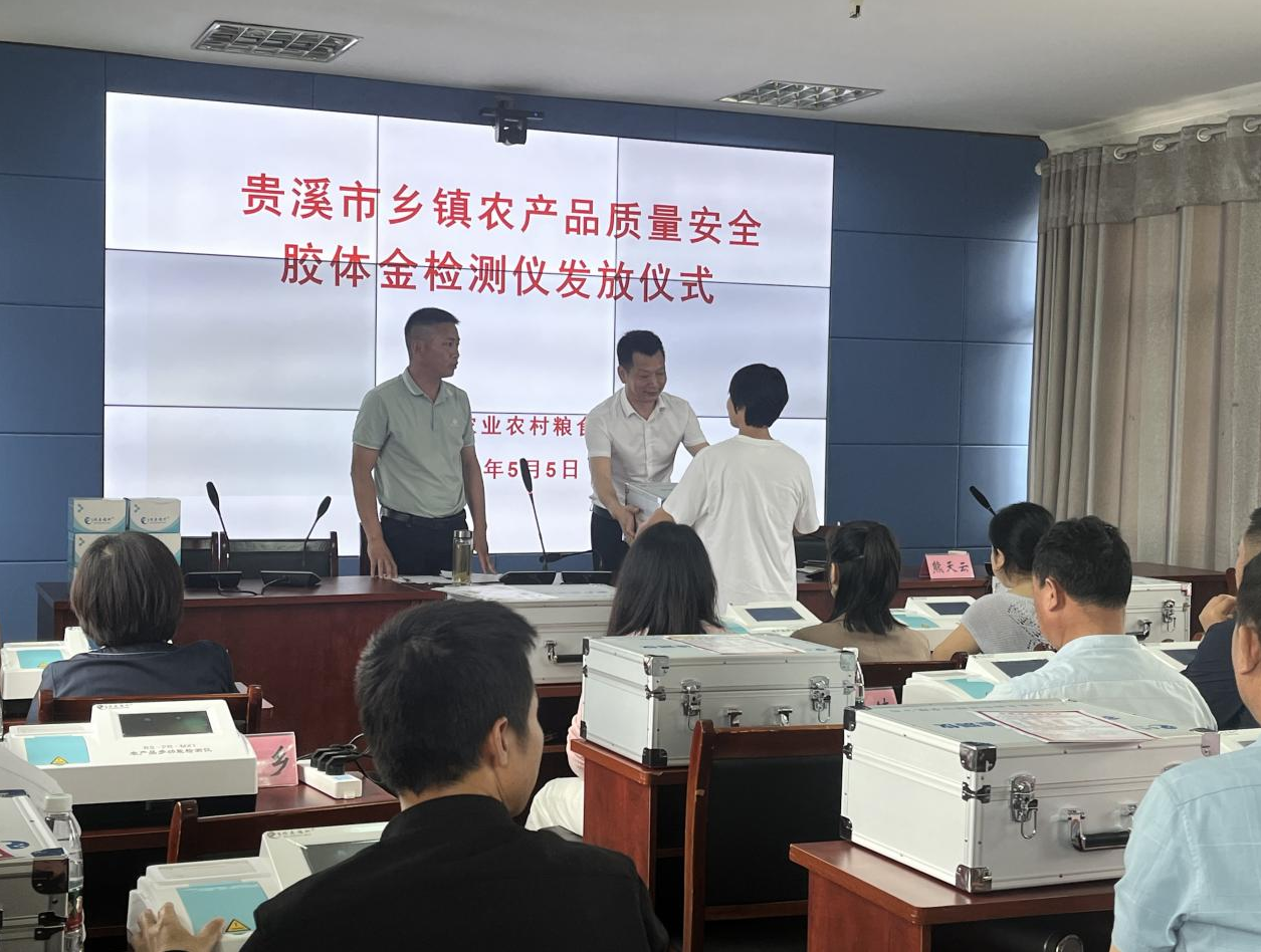 在培訓(xùn)會(huì)上,貴溪市農(nóng)糧局為全市18個(gè)鄉(xiāng)鎮(zhèn)統(tǒng)一配備膠體金、酶抑制多功能快速檢測(cè)儀,局分管領(lǐng)導(dǎo)熊天云就新設(shè)備使用、豇豆種植及檢測(cè)相關(guān)注意事項(xiàng)做了強(qiáng)調(diào),并要求大家堅(jiān)決貫徹落實(shí)新農(nóng)安法,嚴(yán)格按照部省共建有關(guān)要求開(kāi)展農(nóng)安工作,確保及時(shí)有效發(fā)現(xiàn)并處置農(nóng)產(chǎn)品質(zhì)量安全風(fēng)險(xiǎn),確保膠體金免疫檢測(cè)任務(wù)全部按時(shí)完成。