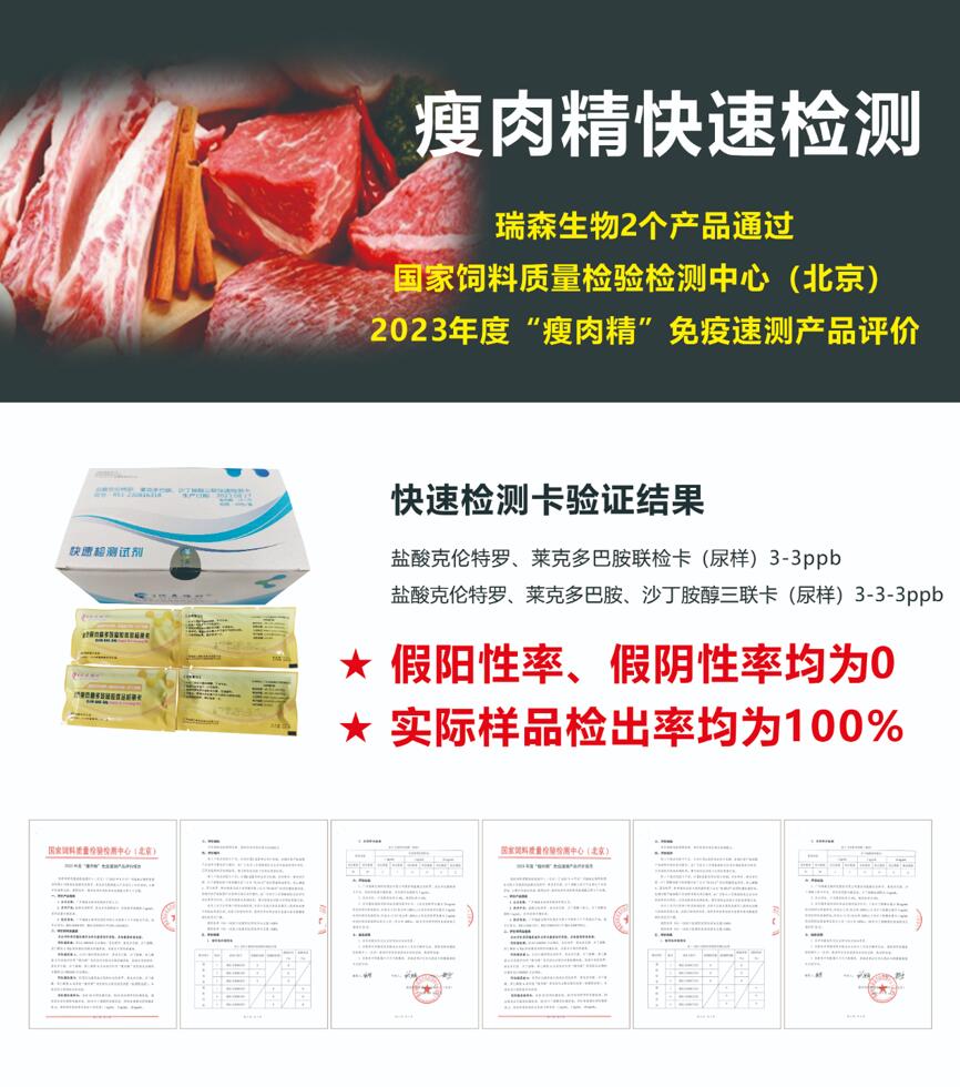 依據(jù)評價指標,瑞森生物“鹽酸克倫特羅、萊克多巴胺聯(lián)檢卡”(尿樣 3-3 ppb)、“鹽酸克倫特羅、萊克多巴胺、沙丁胺醇三聯(lián)卡”(尿樣3-3-3)2種快速檢測卡的假陽性率、假陰性率均為0,實際樣品檢出率均為100%。